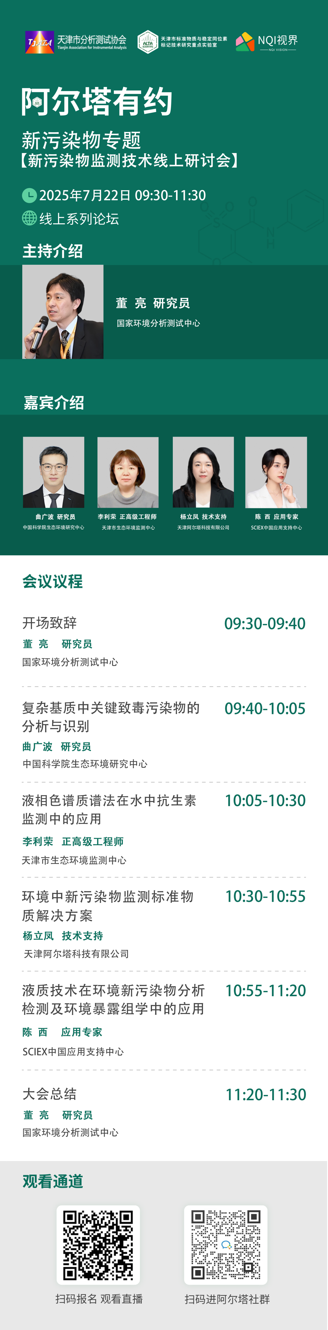 7月22日,由天津市分析測試協會標準物質與檢測技術分會、天津市標準物質與穩定同位素標記技術研究重點實驗室聯合主辦的 “阿爾塔有約第23期—新污染物監測技術研討會” 將在線上舉辦。